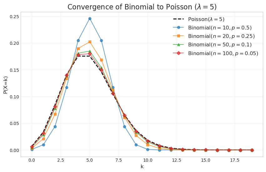 ポアソン分布は、二項分布において試行回数 $n$ を無限大、成功確率 $p$ を極小とする極限として定義される。ここでは、SymPyを用いてこの極限操作を実行し、ポアソン分布の確率質量関数(PMF)を導出する。